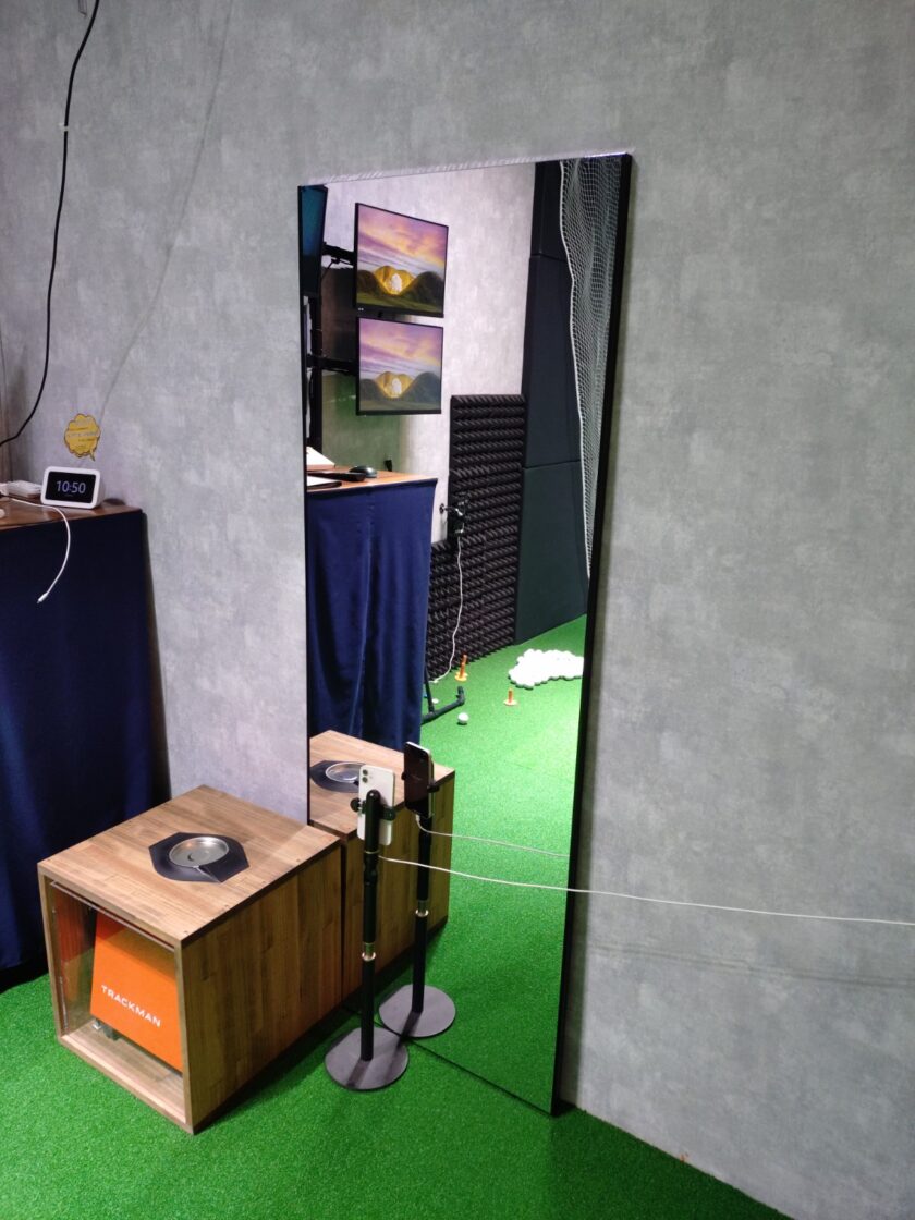 この度、e-GOLF STUDIOに全身ミラーとチェアを新たに設置いたしました! 全身が映る大型ミラーです。Trackman用のデバイスが置いてありますのでご注意ください。 これにより、Trackma…