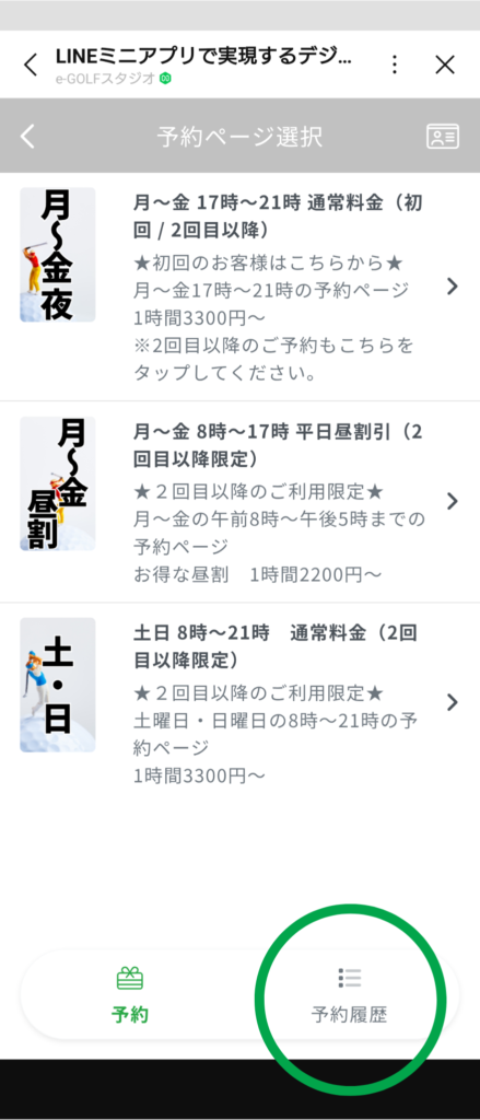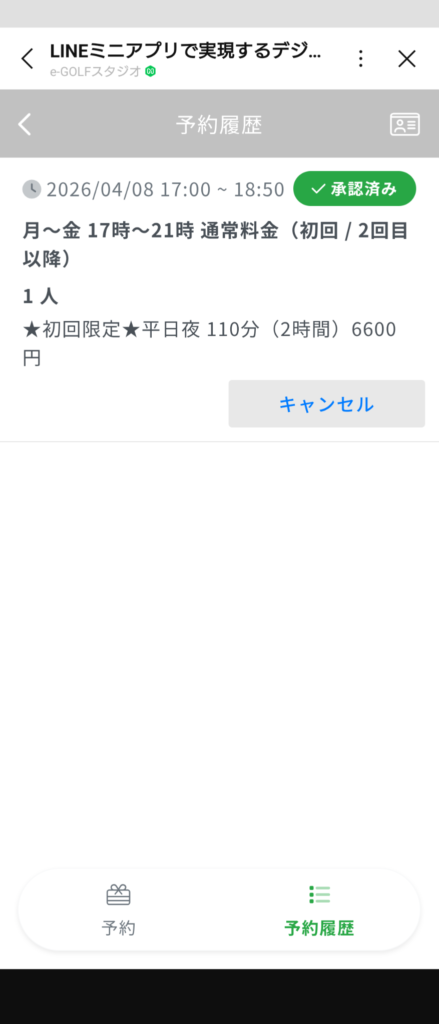 初回ご利用のご予約時は、スタッフがご予約の承認をおこないます。承認後、LINE公式アカウントのトーク画面へ、ご入室方法や駐車場のご利用方法などをメッセージ送信いたします。内容をご確認の上、ご予約の日時にe-GOLF STUDIOへお越しください。