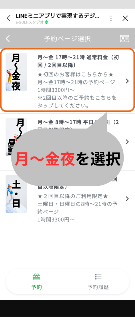 初めてご利用のお客様は、予約ページから「月~金・夜」をお選びください。